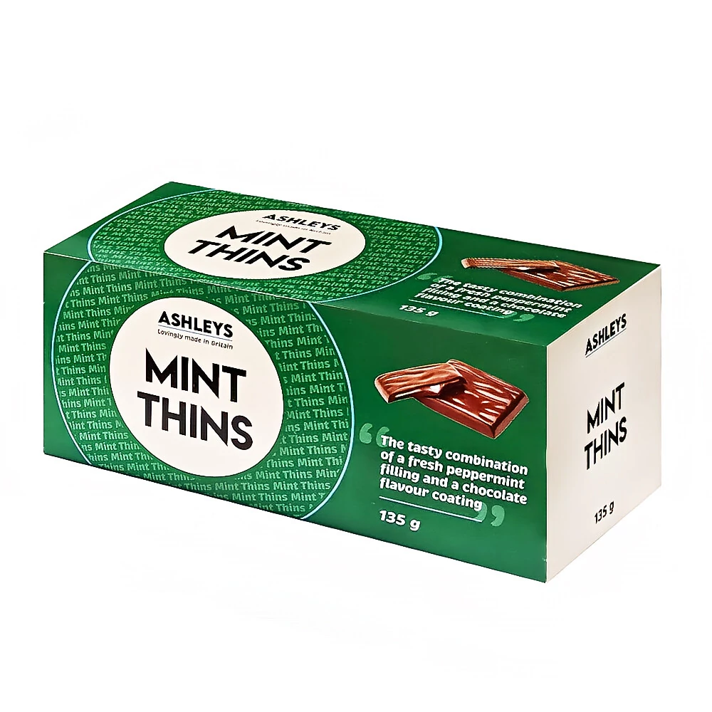 Az Ashley’s Mint Thins egy vékony, ropogós csokoládélap, melynek belsejében sima menta‑krém rejtőzik — tökéletes választás vacsora utáni desszertnek, kávé mellé, vagy akár ajándékként is.