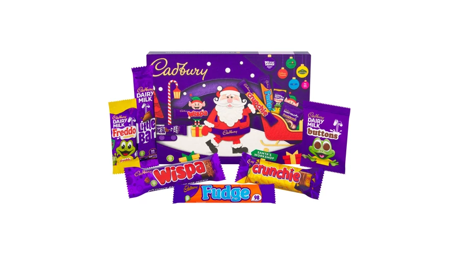 - 1 x 125g Cadbury Selection Box containing six Cadbury chocolate products including Dairy Milk, Crunchie, Cadbury Fudge, Dairy Milk Buttons, Double Decker and Wispa.