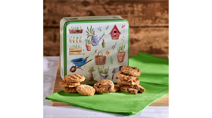 Bájos, dombornyomott fémdoboz romantikus kertészkedős („Pottering Garden”) jelenettel, amely az angol vidéki kertek nyugodt hangulatát idézi. A dekoratív doboz finom kekszválogatást rejt, így tökéletes ajándék vagy elegáns vendégváró finomság.