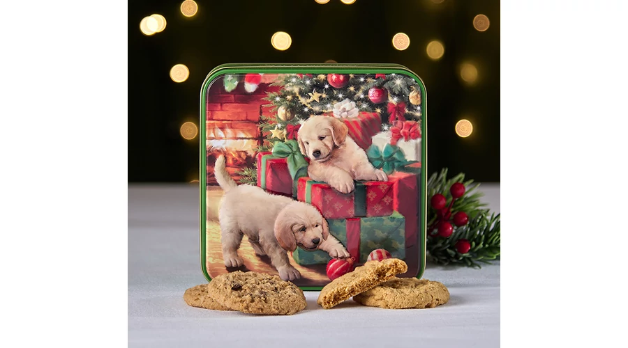 Ünnepi, dombornyomott fémdoboz két vidám kölyökkutyával ajándékok között, karácsonyi hangulatú jelenettel – benne pedig kétféle prémium minőségű kekszválogatás.