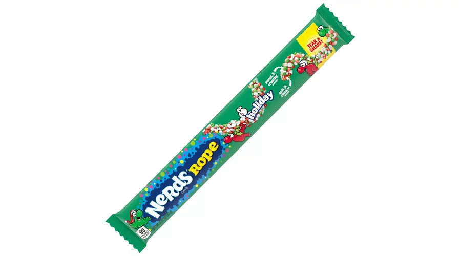 A Nerds Holiday Ropes egy rágós gumiszál, amelyet színes, roppanós Nerds cukorkadarabok borítanak. A piros-zöld-fehér ünnepi színek és a savanyú-édes gyümölcsös ízvilág különleges, karácsonyi hangulatú finomsággá teszik.