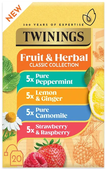 A Twinings Fruit & Herbal Classic Collection egy koffeinmentes tea válogatás, amely négy népszerű gyógynövény- és gyümölcsinfúziót tartalmaz. A változatos ízeknek köszönhetően tökéletes választás mindennapi teázáshoz, pihenéshez vagy esti fogyasztásra.