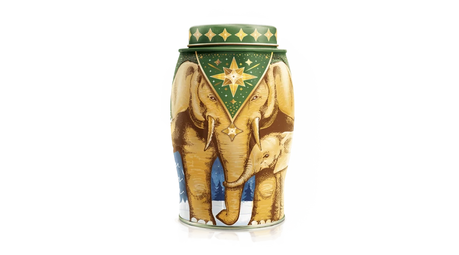 A Williamson Golden Star Elephant Tea Caddy egy elegáns, arany díszítésű elefánt alakú fémdoboz, amely prémium minőségű English Breakfast fekete teát tartalmaz. A dekoratív, gyűjthető csomagolás és a telt ízű kenyai tea különleges ajándékká és stílusos konyhai kiegészítővé teszi.
