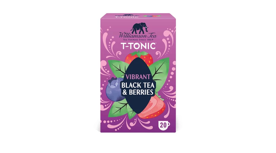 A Williamson T-Tonic Black Tea & Berry Infusion egy gyümölcsösen friss fekete tea, amely a kenyai Kaimosi ültetvényen termesztett tealeveleket eper, málna és áfonya aromáival kombinálja. Élénk, üdítő ízű tea, amely melegen és jegesen is kiváló választás.