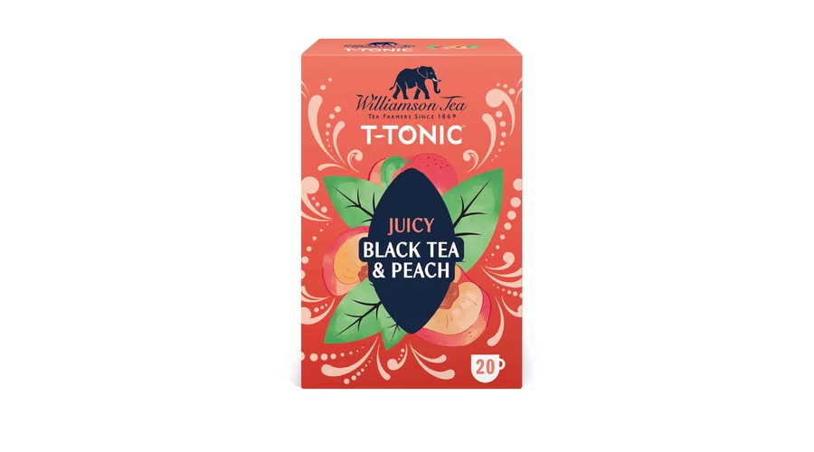 A Williamson T-Tonic Black Tea & Peach egy gyümölcsösen friss fekete tea, amely a kenyai Kaimosi ültetvényen termesztett tealeveleket napérlelte őszibarack aromával kombinálja. Természetesen édeskés, könnyed ízű tea, amely melegen és jegesen is kiváló választás.